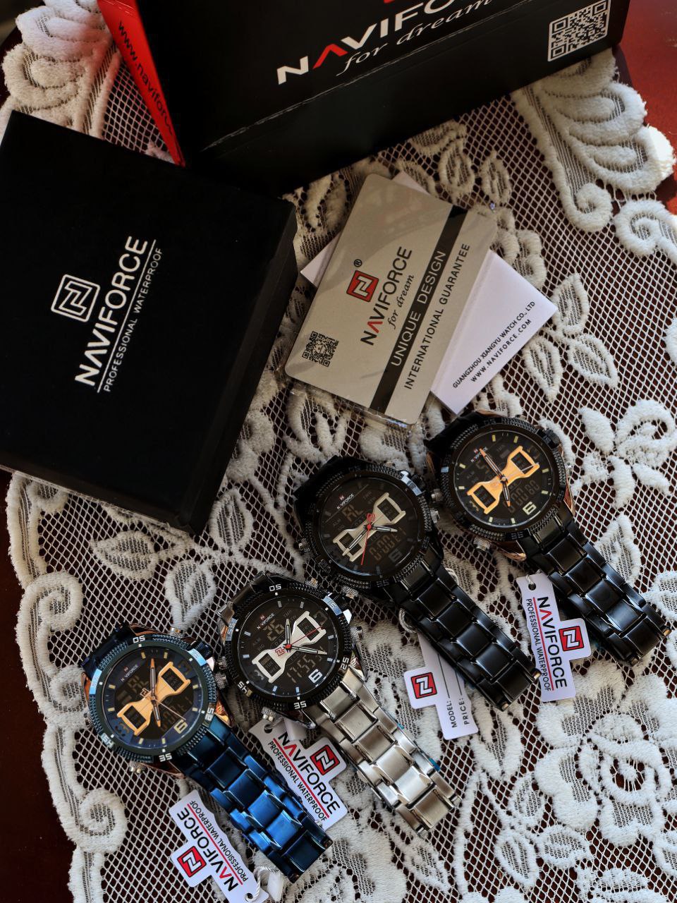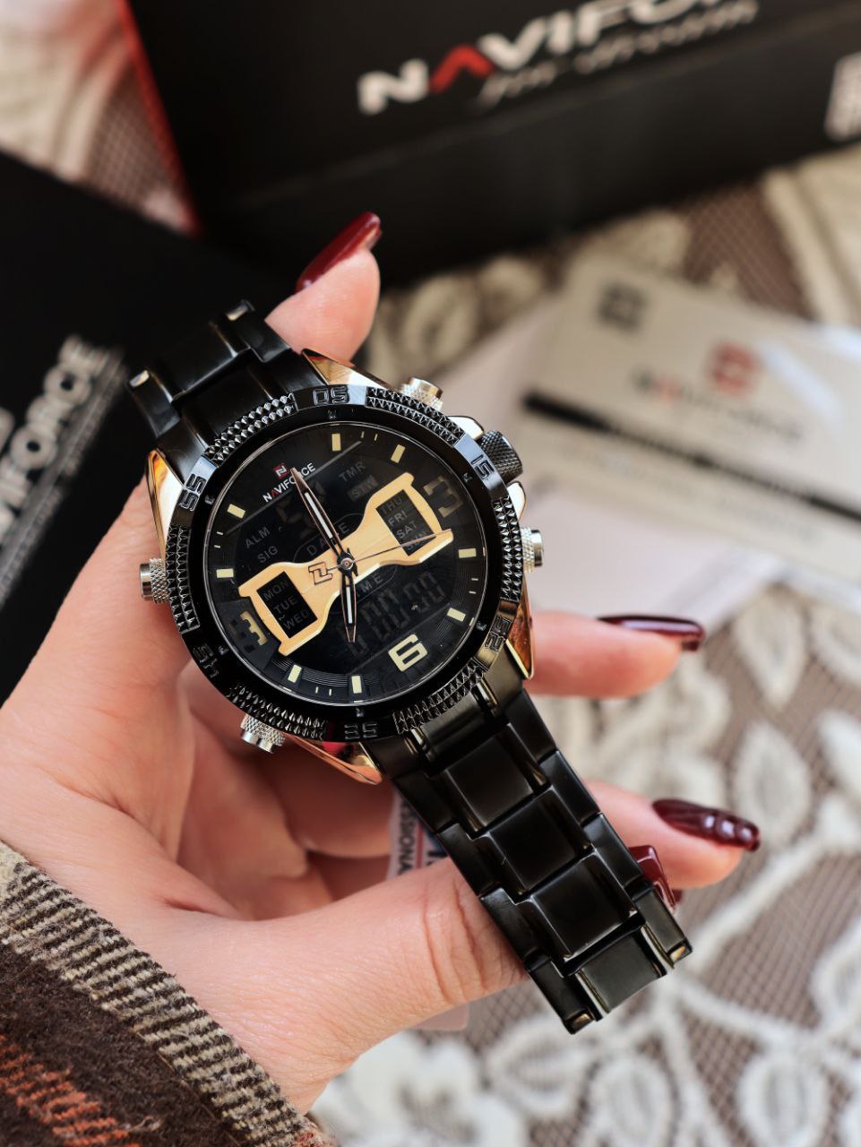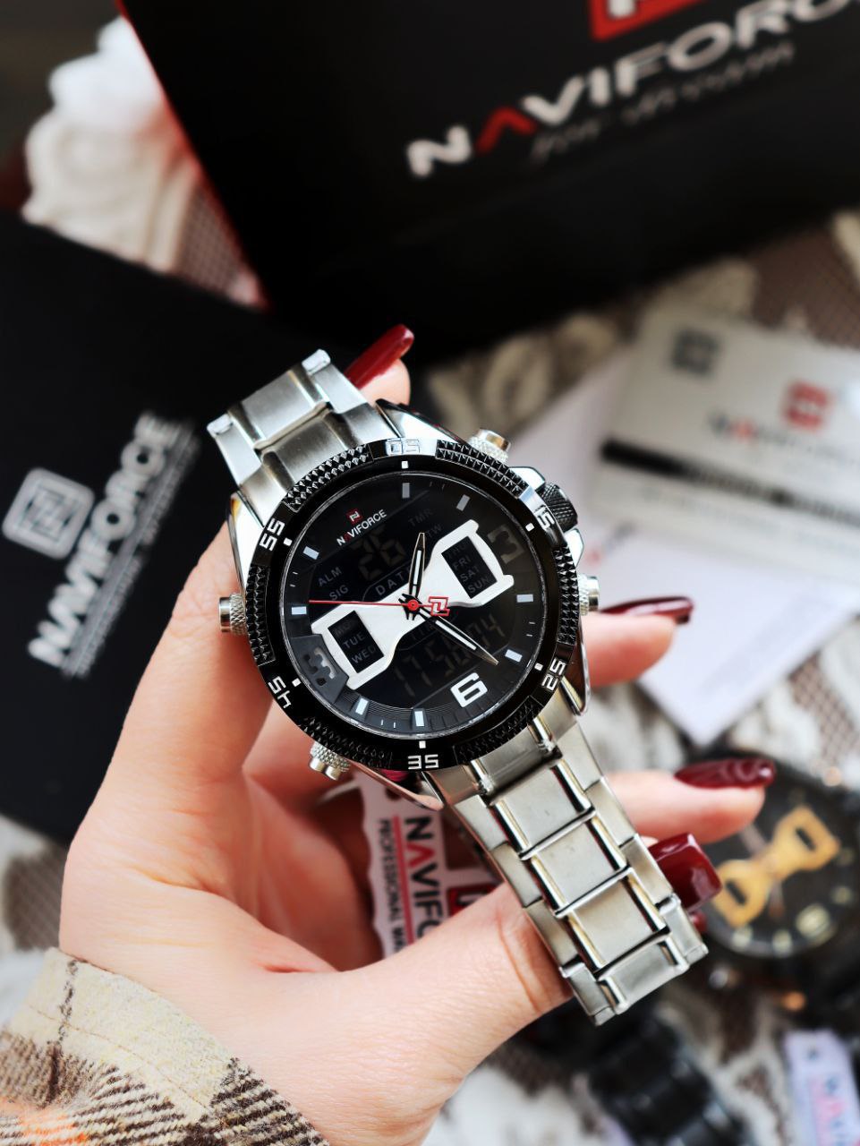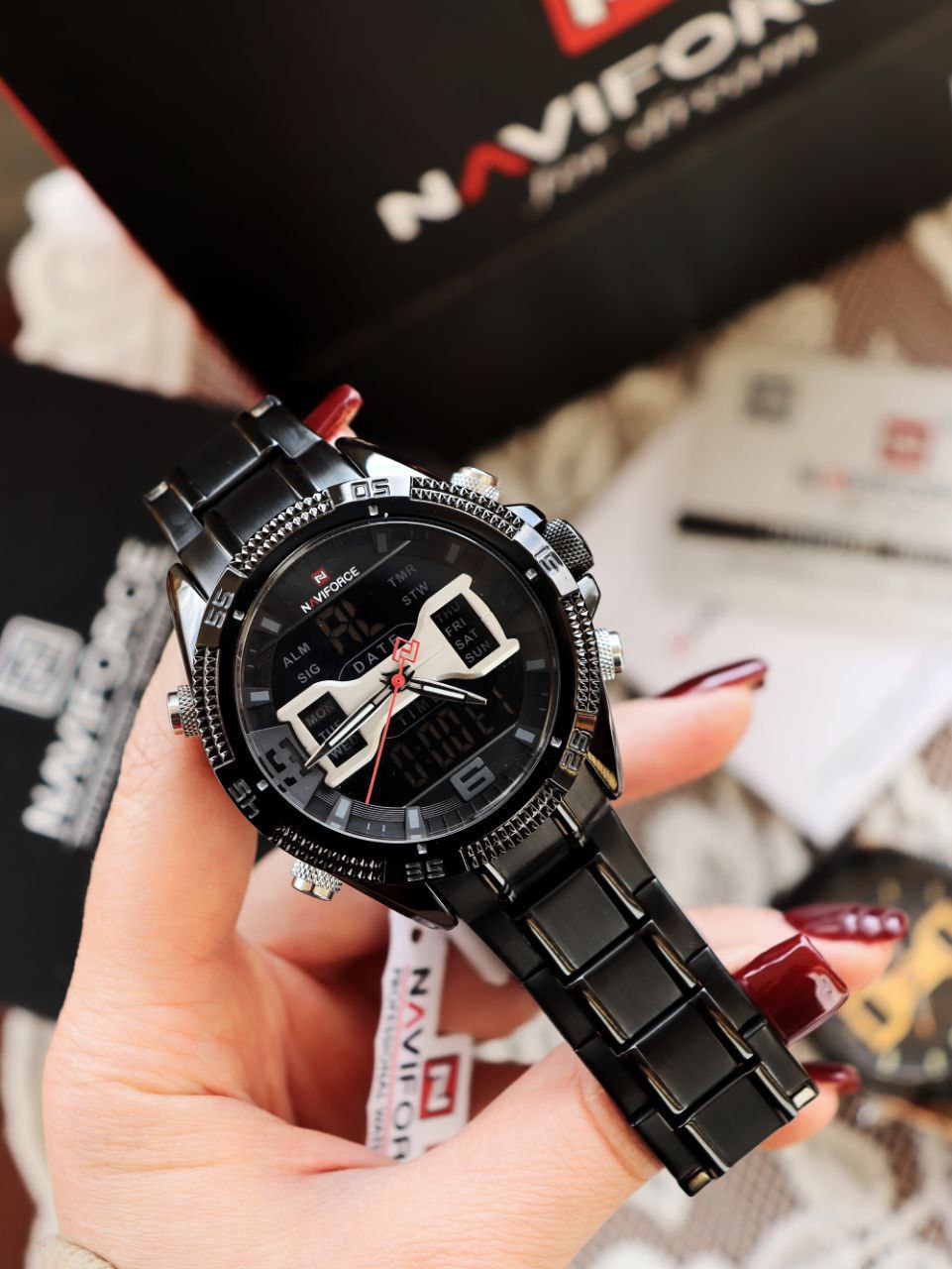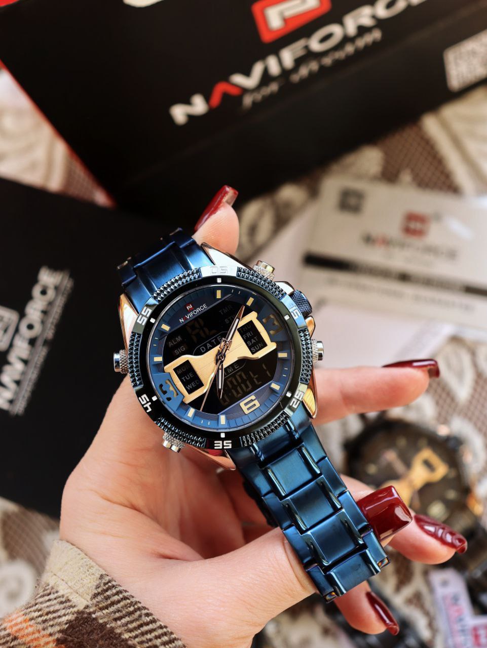 ساعت اورجینال مردانه نیوی فورس مدل 9201 بندقفلی دوزمانه آلارم و چراغدار کرنومتر رنگ ثابت موتور ژاپن همراه با جعبه و پاکت